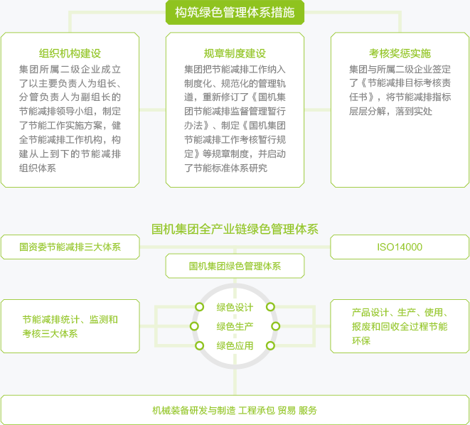 國機集團堅持綠色、低碳發展理念,以節能環保關鍵技術和產品研發為支撐,以節能環保工程集成服務為主線,加快構建資源節約、環境友好的生產方式和運營模式,在實現自身低碳運營的同時,大力推動綠色行業標準制定,促進機械制造業的環保低碳發展,為建設“美麗中國”貢獻力量。